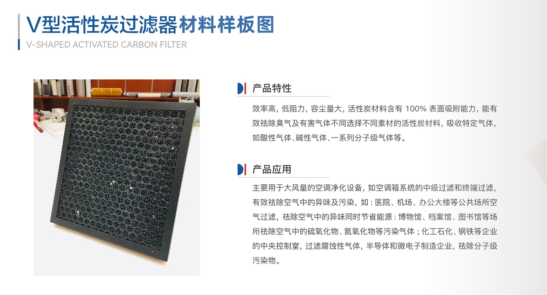 主要用于大風量的空調凈化設備,如空調箱系統(tǒng)的中級過濾和過濾祛除空氣中的異味及污染,如:醫(yī)院、機場、辦公大樓等公共場所空氣過濾,祛除空氣中的異味同時節(jié)省能源:博物館、檔案館、圖書館等場所祛除空氣中的硫氧化物、氮氧化物等污染氣體;化工石化、鋼鐵等企業(yè)的中央控制室,過濾腐蝕性氣體,半導體和微電子制造企業(yè),祛除分子級污染物。