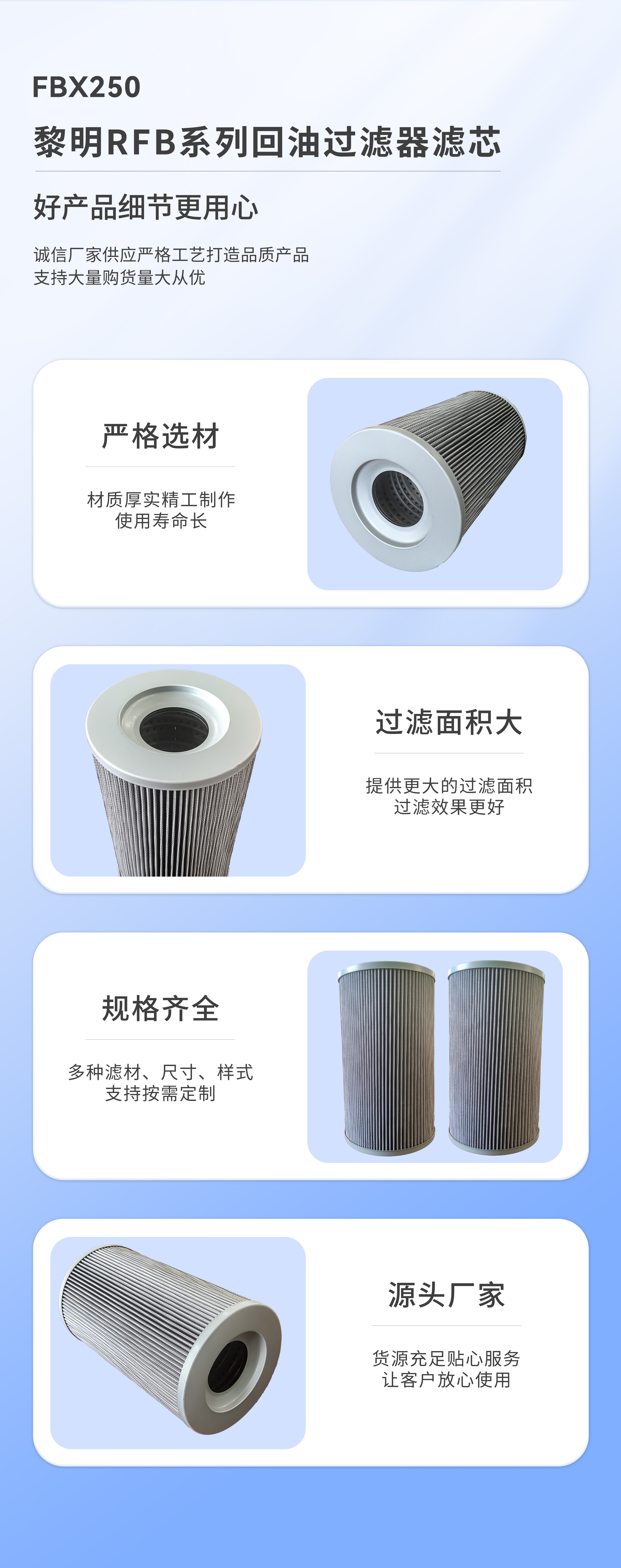 【產品簡介】:濾芯的濾材一般都要做成波紋狀由3-5層折疊而成,采用濾材成型設備,這樣才能使多層復合纖維緊緊靠在支承網上,如果支承網與纖維濾材沒有靠死,就說明它制作工藝欠佳。黎明FBX250回油過濾器濾芯 流量:250L/min 精度:1、3、5、10、20、30微米可選。